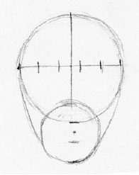 If you draw a line straight across the head from the points where the lines join the two circles together, you have a guideline for the top of the eyes.The line that marks the bottom of the uppermost circle becomes a guide for the bottom of the nose, and the lips fall half an eye length below that point.