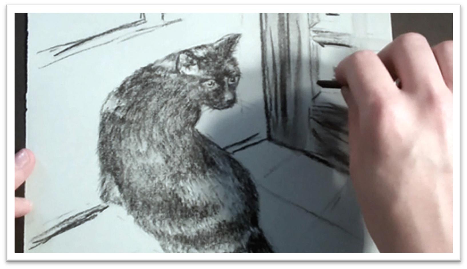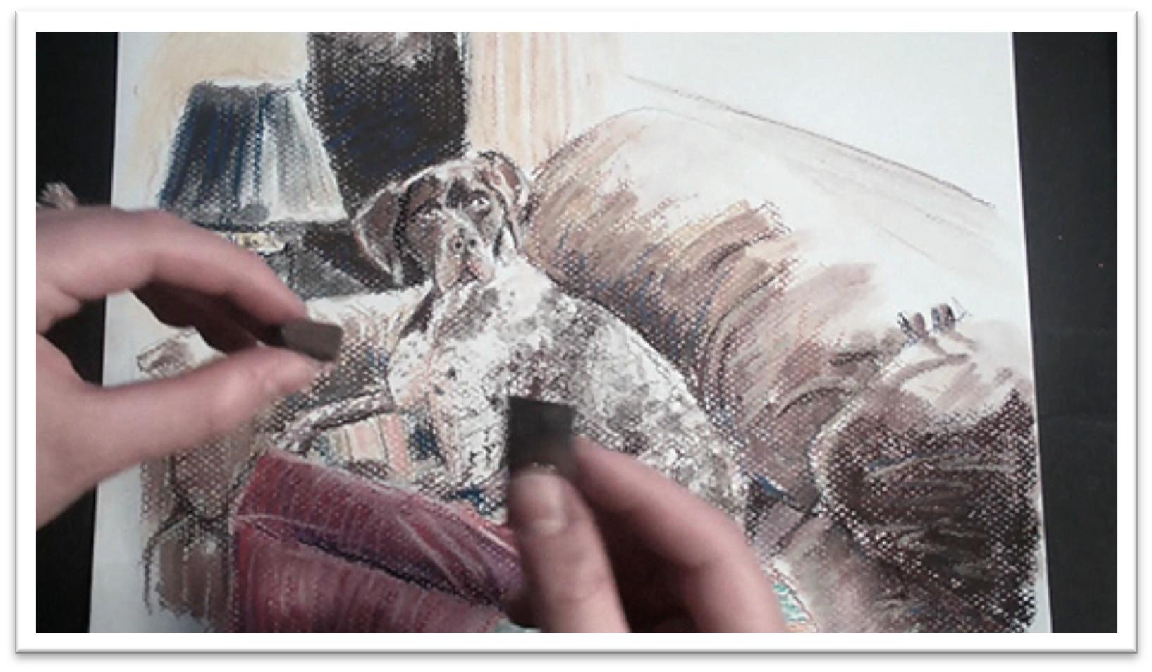 The broad, dark area of the background that the dog is melting into can be laid down easily with crosshatched strokes of the willow charcoal and then blended or not as you wish.