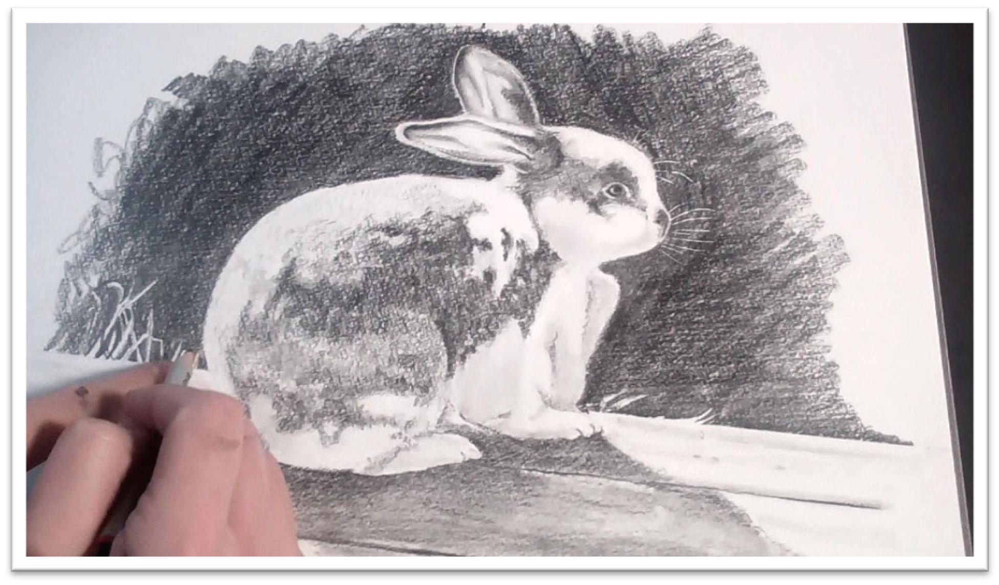 Begin laying in tone on the face and in the shadow of the body, then blend with your finger. Add lines in the fur to show the direction of the fur growth as you work, re-darkening as needed after blending.