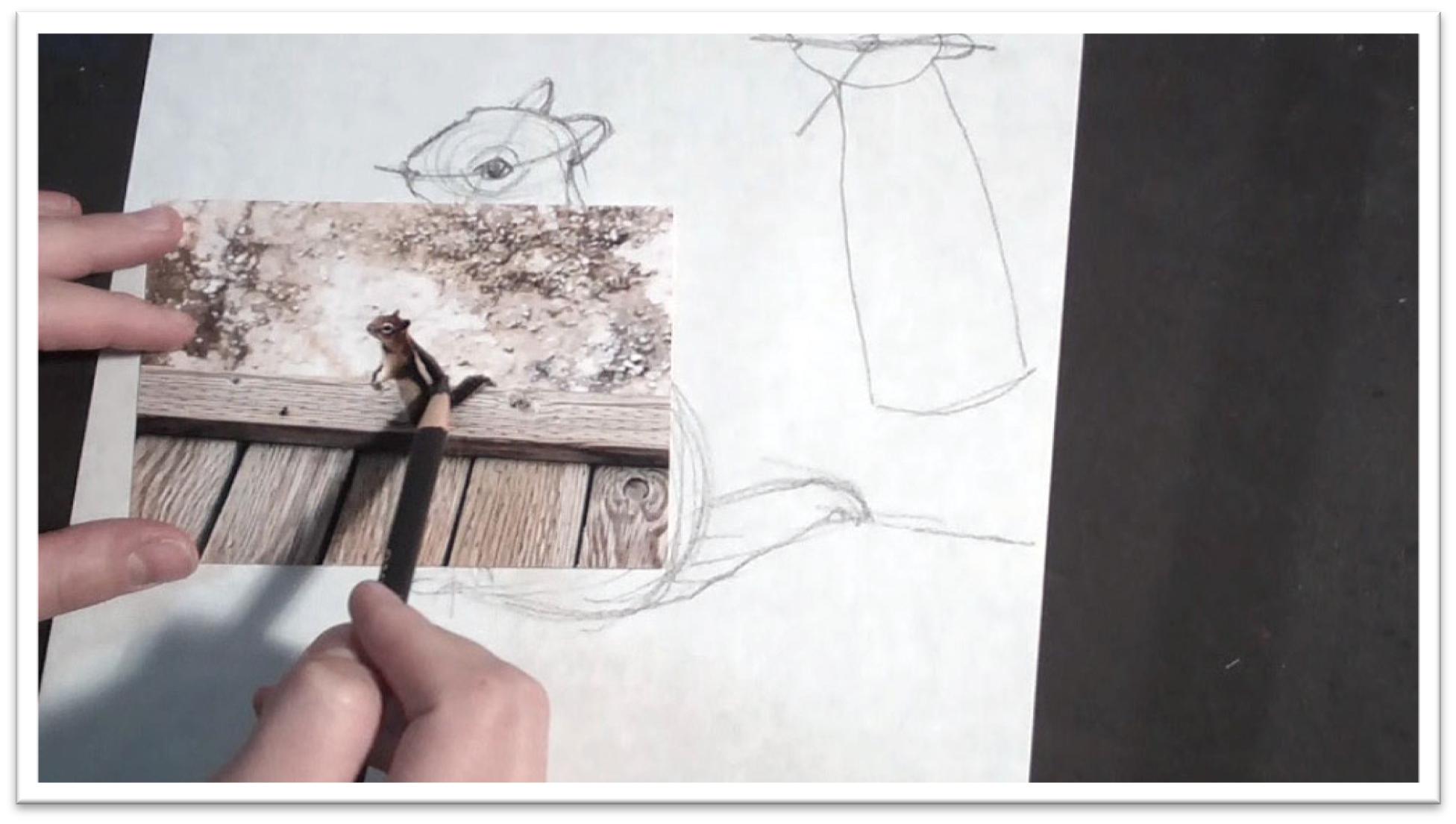 You’re not outlining, but merely darkening up a place here and there. The patterns in the chipmunk’s fur need to be very clear and distinct.