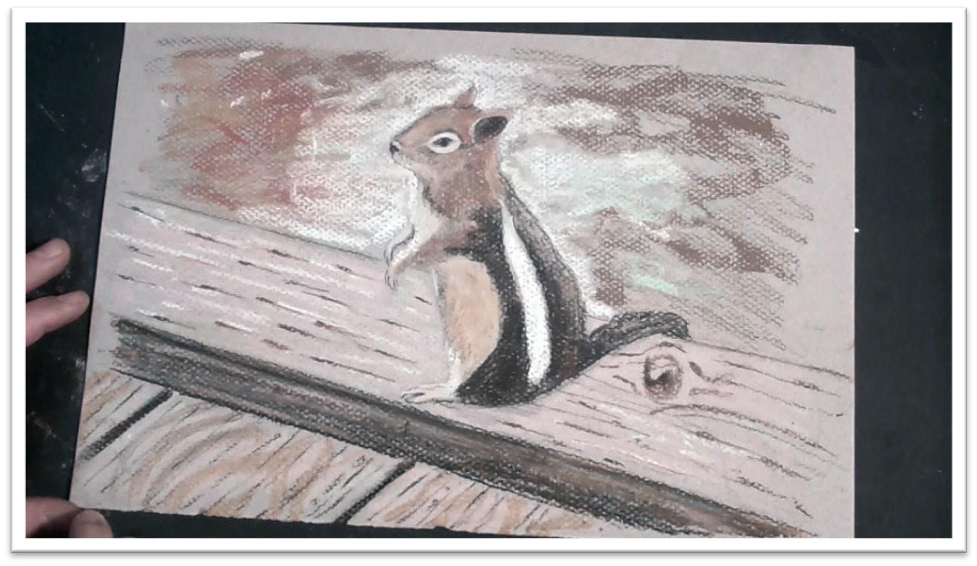 Blend the wood tones smooth, then tighten up the features of the chipmunk further with charcoal and pastel pencils. They should be nice and sharp so that you can lay in individual flyaway hairs in the tail, line of the back, belly, and face.